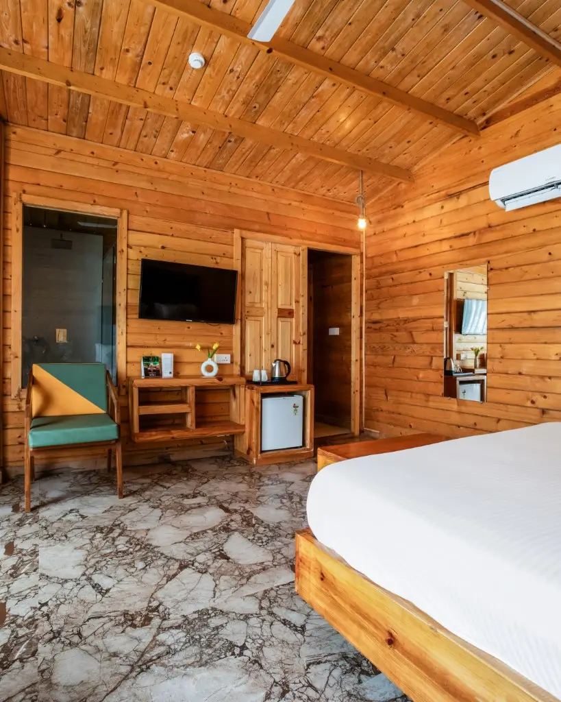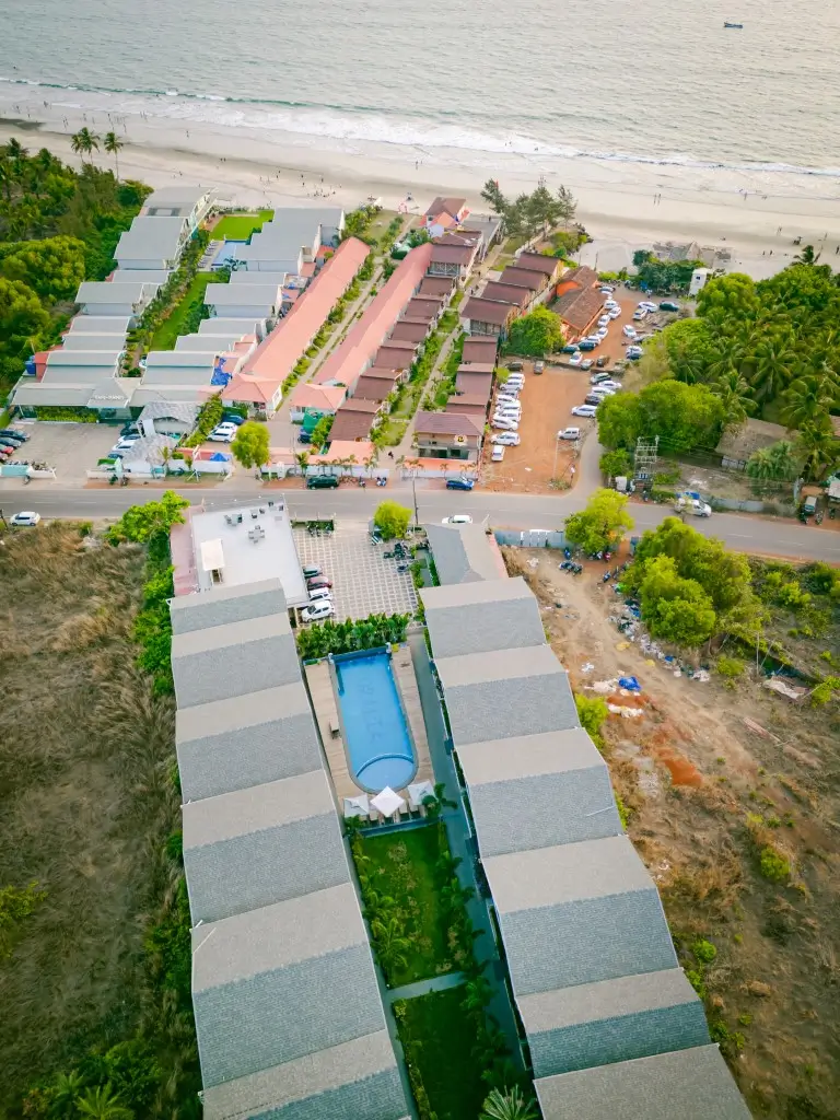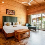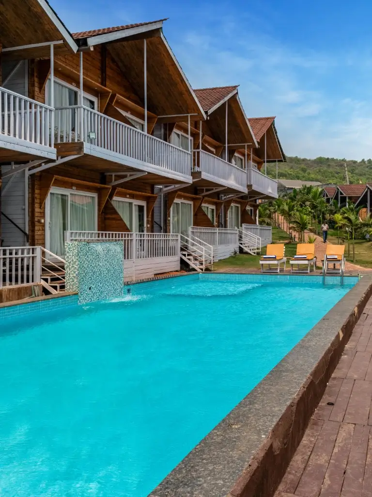 Our wooden cottage pool facing rooms in Morjim North Goa place you at the lively heart of Dallas. From the balcony, you look directly over the shimmering pool, with the ocean breeze drifting in from Ashvem. Families often gather here between swims, while couples enjoy the easy buzz of the deck.